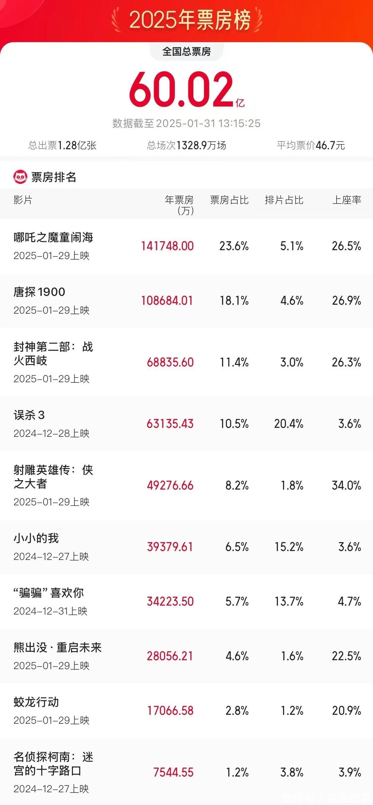 《哪吒之魔童闹海》暂列年度票房榜首位