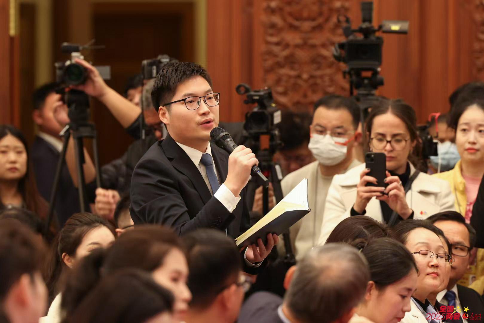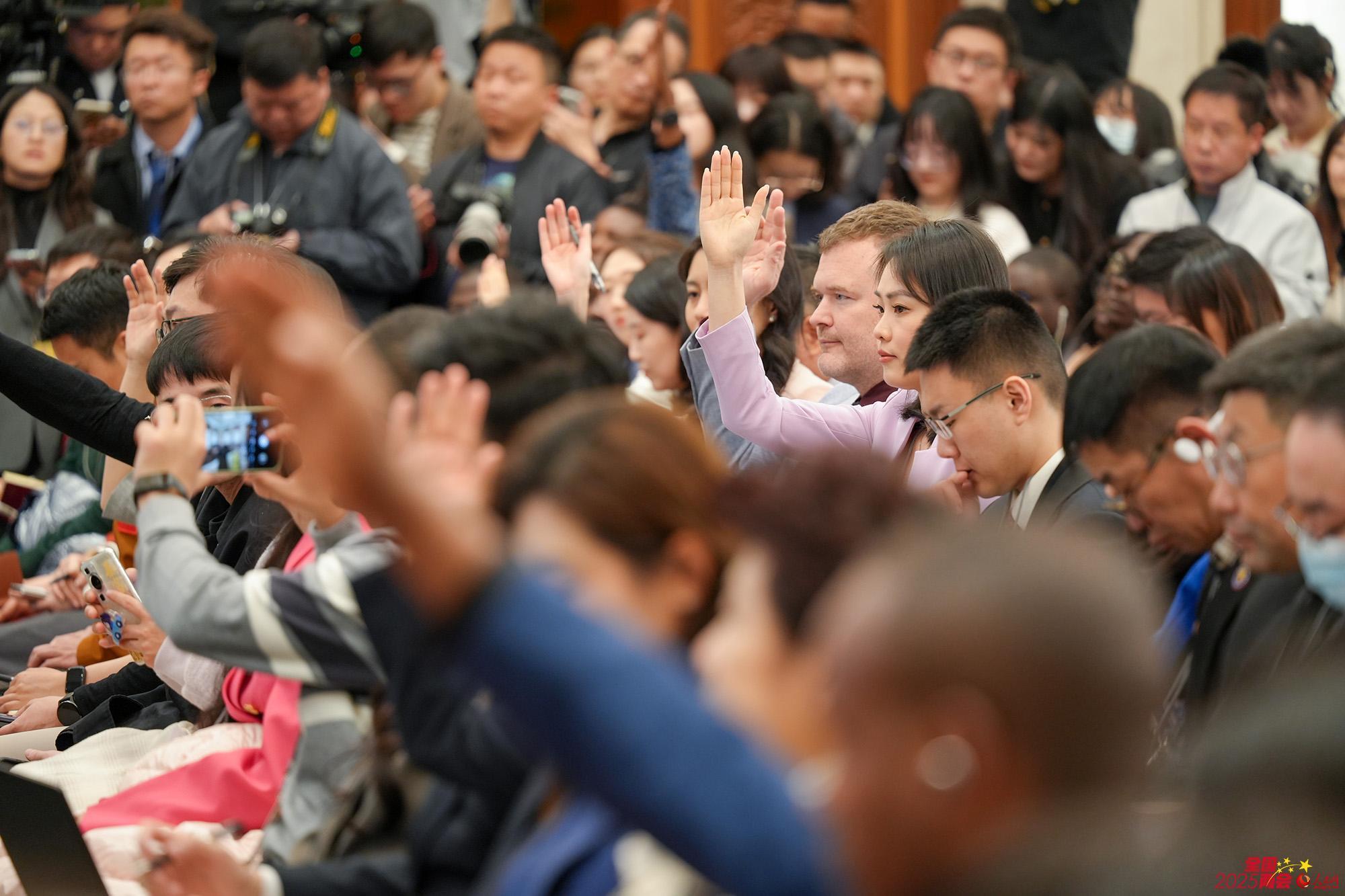 东谈主民日报记者在寰宇政协十四届三次会议新闻发布会现场发问。东谈主民网记者 李兆民摄 寰宇政协十四届三次会议新闻发布会现场,中外媒体记者举手发问。东谈主民网记者 苗子健摄