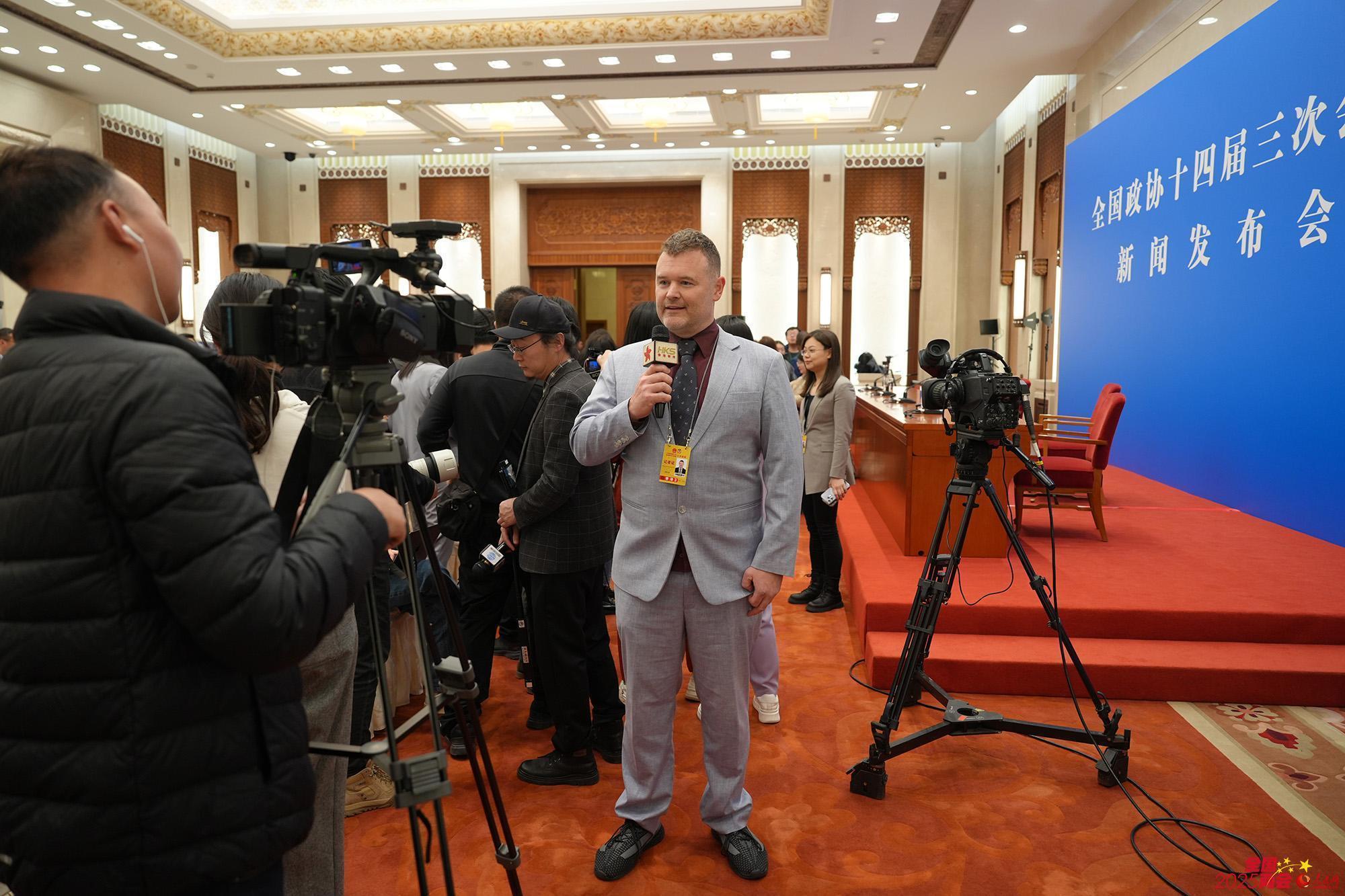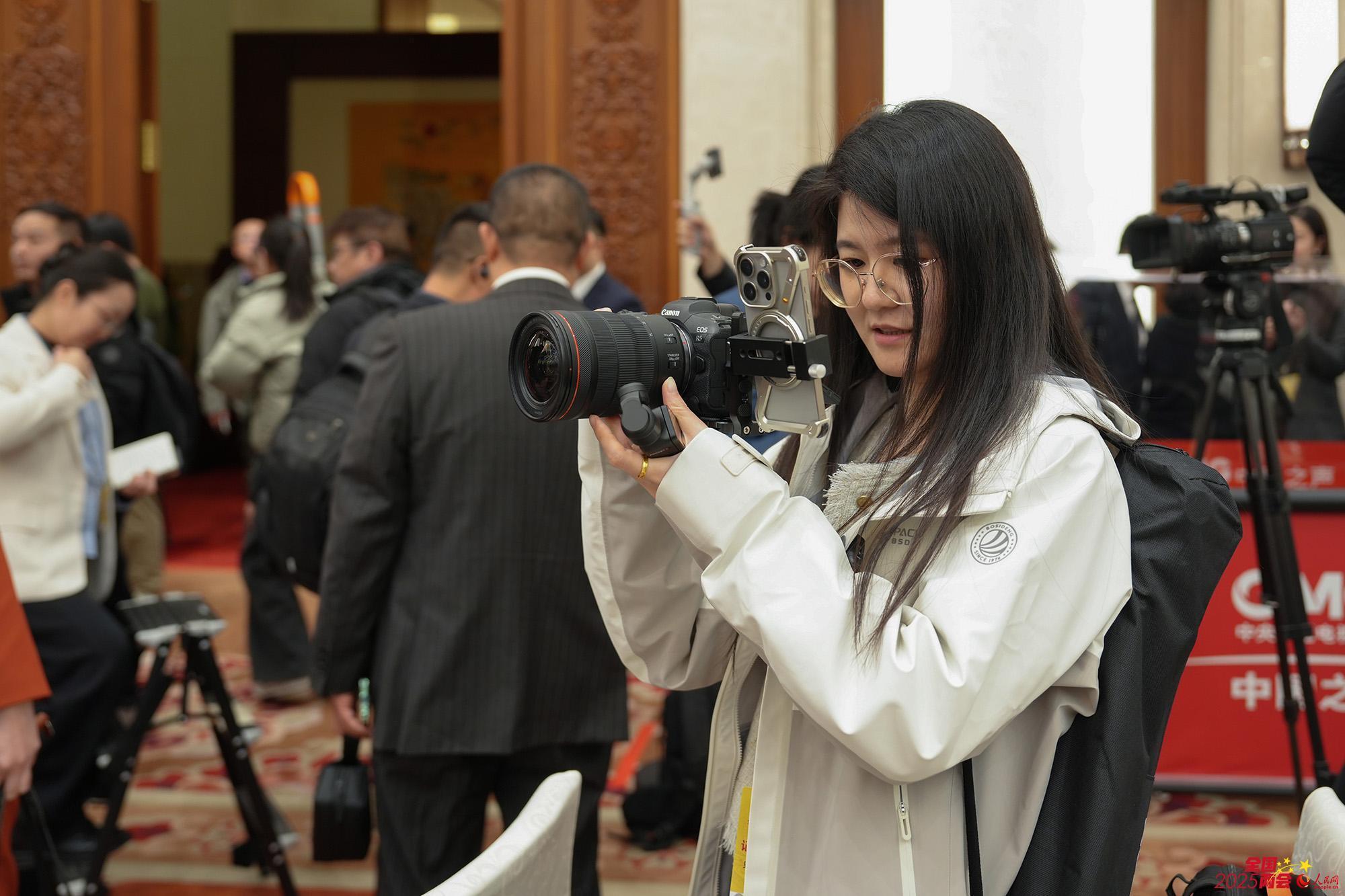 寰宇政协十四届三次会议新闻发布会纵容后,一位番邦记者在会场出镜采访。东谈主民网记者 苗子健摄 东谈主民网记者在寰宇政协十四届三次会议新闻发布会现场拍摄报谈。东谈主民网记者 苗子健摄