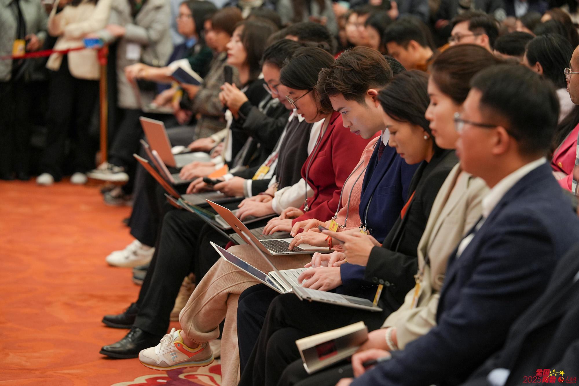 寰宇政协十四届三次会议新闻发布会现场。东谈主民网记者 李兆民摄 记者在寰宇政协十四届三次会议新闻发布会现场发愤责任。东谈主民网记者 苗子健摄