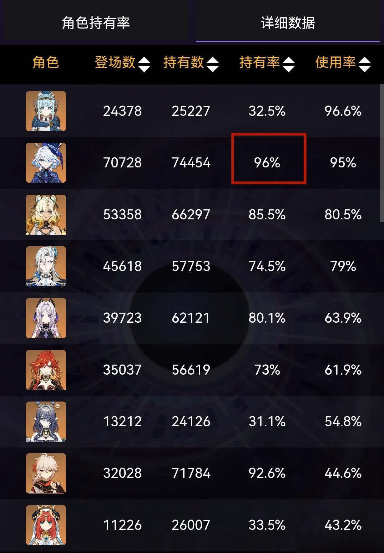 还有一个阻截易被玩家发现的问题,就是玩家捏有率了,芙宁娜的捏有率在现时的提瓦特内部最高的,隔邻希诺宁才85.5%,万叶的捏有率才拼凑达到芙宁娜,可东说念主家才92.6%的捏有率,而芙宁娜以96%的捏有率,险些可以说是原神内部东说念主手一个芙宁娜了,100个玩家惟一4个玩家莫得芙宁娜,这个比例有多离谱就无用说了。